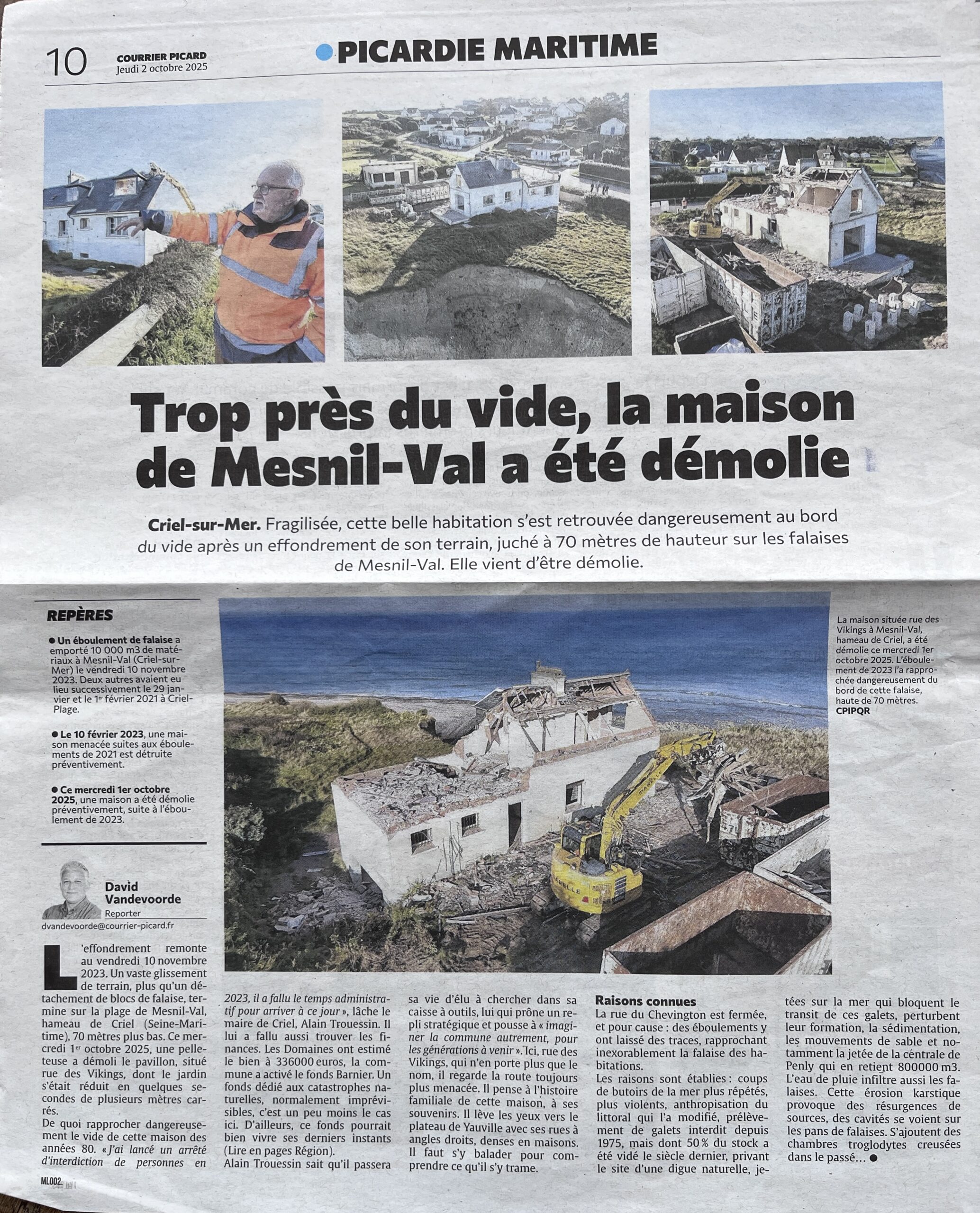 Érosion des falaises « Mers-les-Bains. Un travail artistique pour sensibiliser à la question de l’érosion des falaises » L’Informateur 1° mai 2025