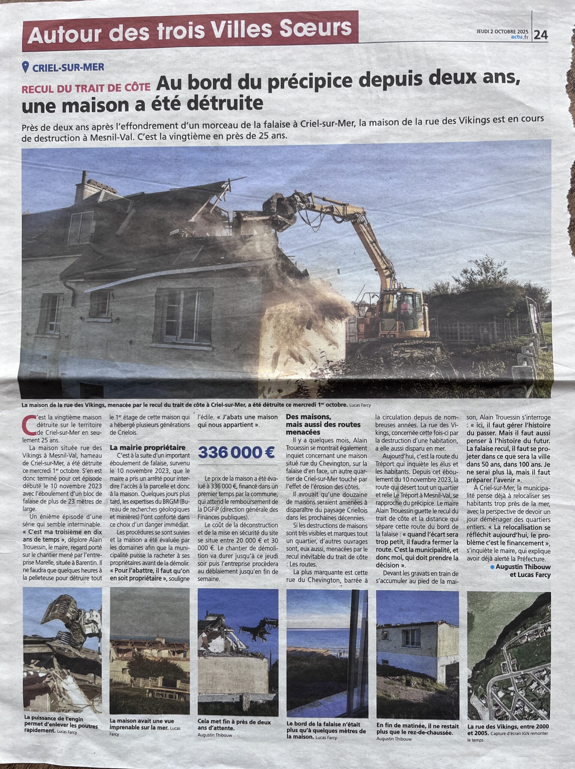 Gestion communale « Une municipalité « fière » de ses comptes et investissements. Le maire a dressé un bilan très positif de l’action municipale depuis 2020 » Le Courrier Picard 17 mars 2025 : La très bonne situation financière de la commune ne fait que renforcer notre impatience de voir traités rapidement les problèmes d’eau pluviale rue de Paris et boulevard Michel Couillet, les dégradations de la casquette en haut de la falaise et l’étude du prolongement de la digue 83.