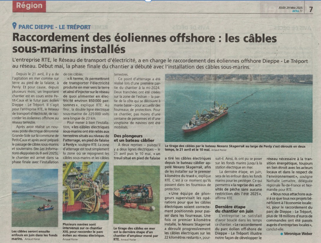 Énergie-Littoral Raccordement des éoliennes offshore : les câbles sous-marins installés. L’Informateur 29 mai 2025 : L’entreprise RTE affirme : « Le raccordement du parc éolien off-shore de Dieppe-le Tréport illustre notre façon de développer le réseau nécessaire à la transition énergétique, toujours en lien étroit avec les acteurs locaux et dans le respect de l’environnement ». En réalité, les critiques et oppositions locales ne valident pas ces affirmations.