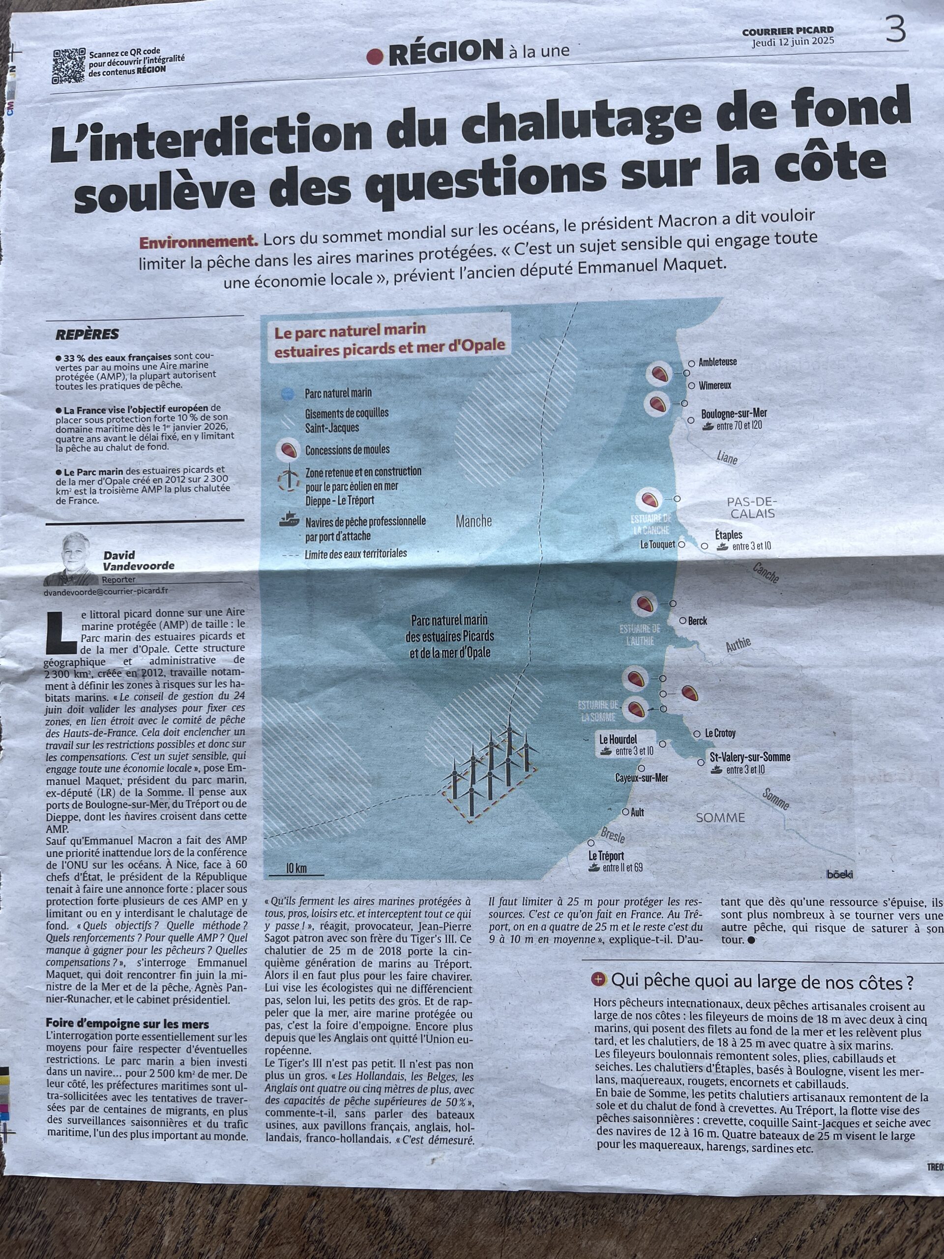 Biodiversité L’interdiction du chalutage de fond soulève des questions sur la côte. Courrier Picard 12 juin 2025 : Le chalutage porte atteinte aux fonds marins et aux espèces vivantes. Jusqu’à présent il n’est pas interdit dans les aires marines protégées qui mériteraient une meilleure protection. On ne regrettera pas la réduction des abus de la pêche industrielle. Mais que faire pour la pêche artisanale locale ?