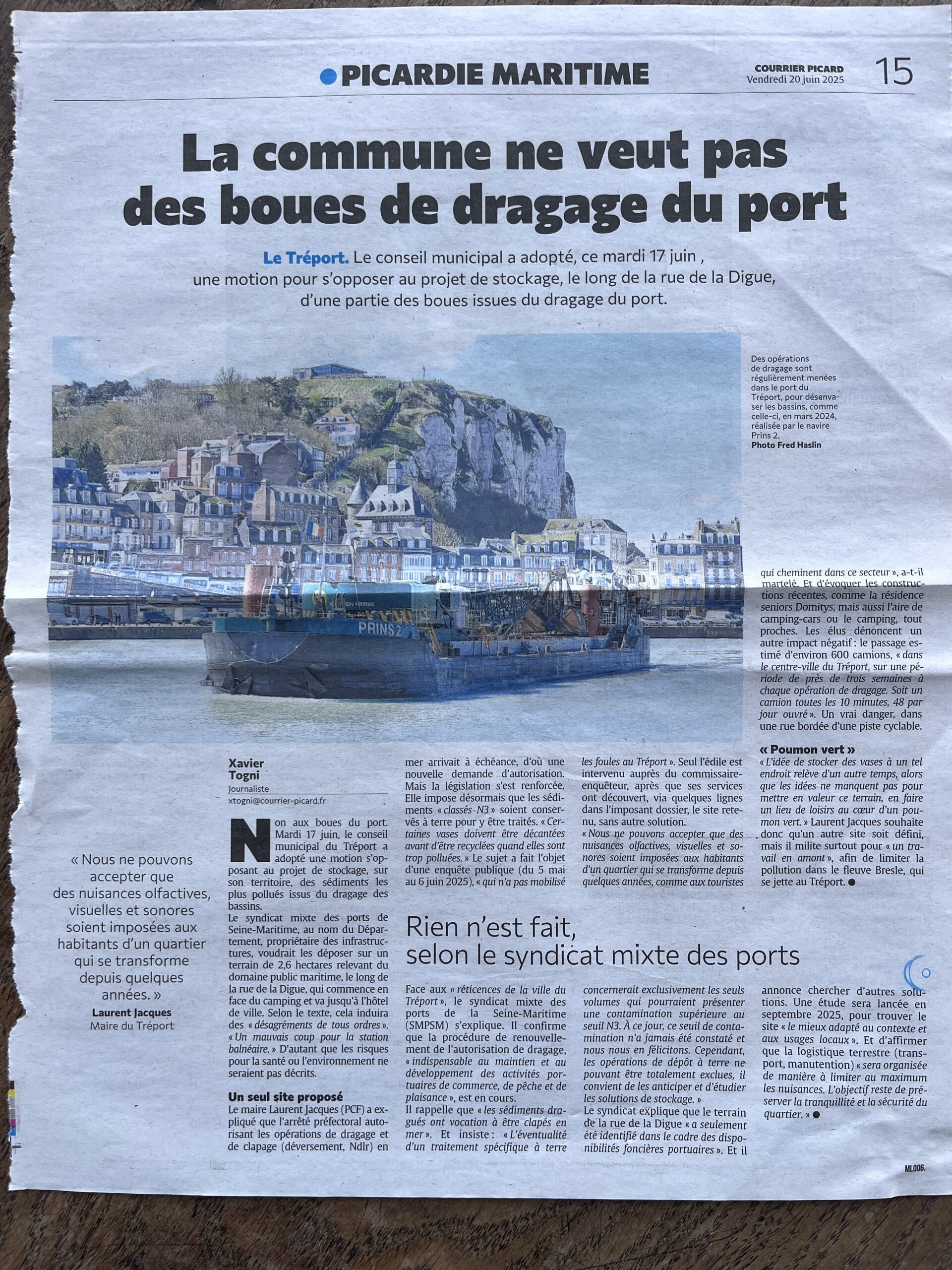 Littoral Le Tréport. La commune ne veut pas des boues de dragage du port. Courrier Picard 20 juin 2025 : Rappelons que les pêcheurs à pied de la baie de Somme se plaignent de la pollution due au rejet en mer de vases.