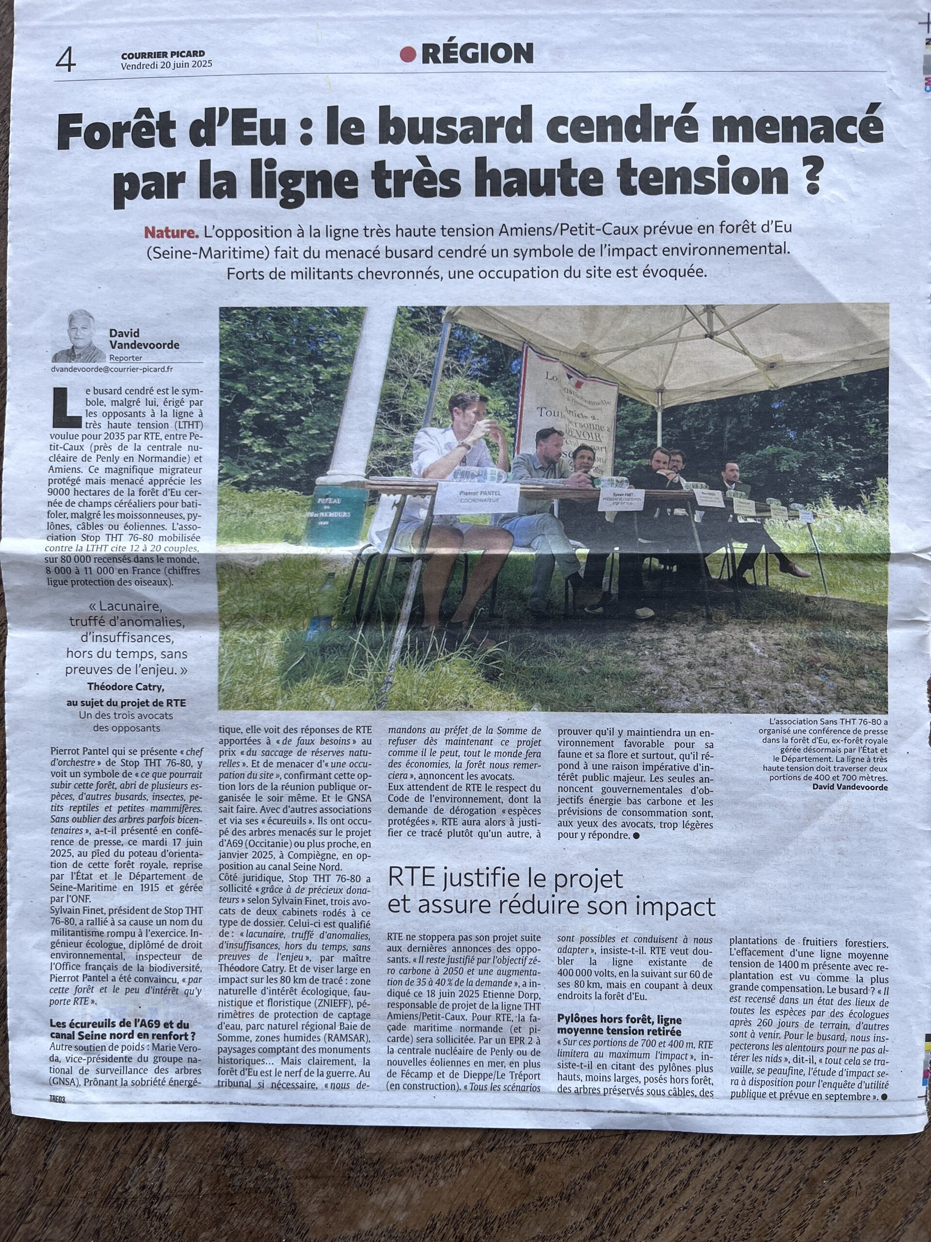 Énergie Forêt d’Eu : le busard cendré menacé par la ligne très haute tension ? Courrier Picard 20 juin 2025 : Mobilisation de l’association Stop THT 76-80