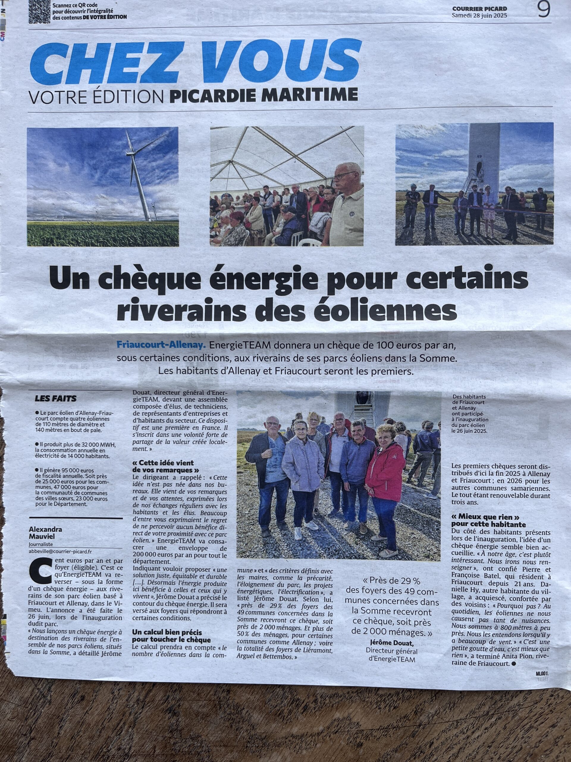 Énergie Un chèque énergie pour certains riverains des éoliennes. Courrier Picard 28 juin 2025 : Mieux que rien.