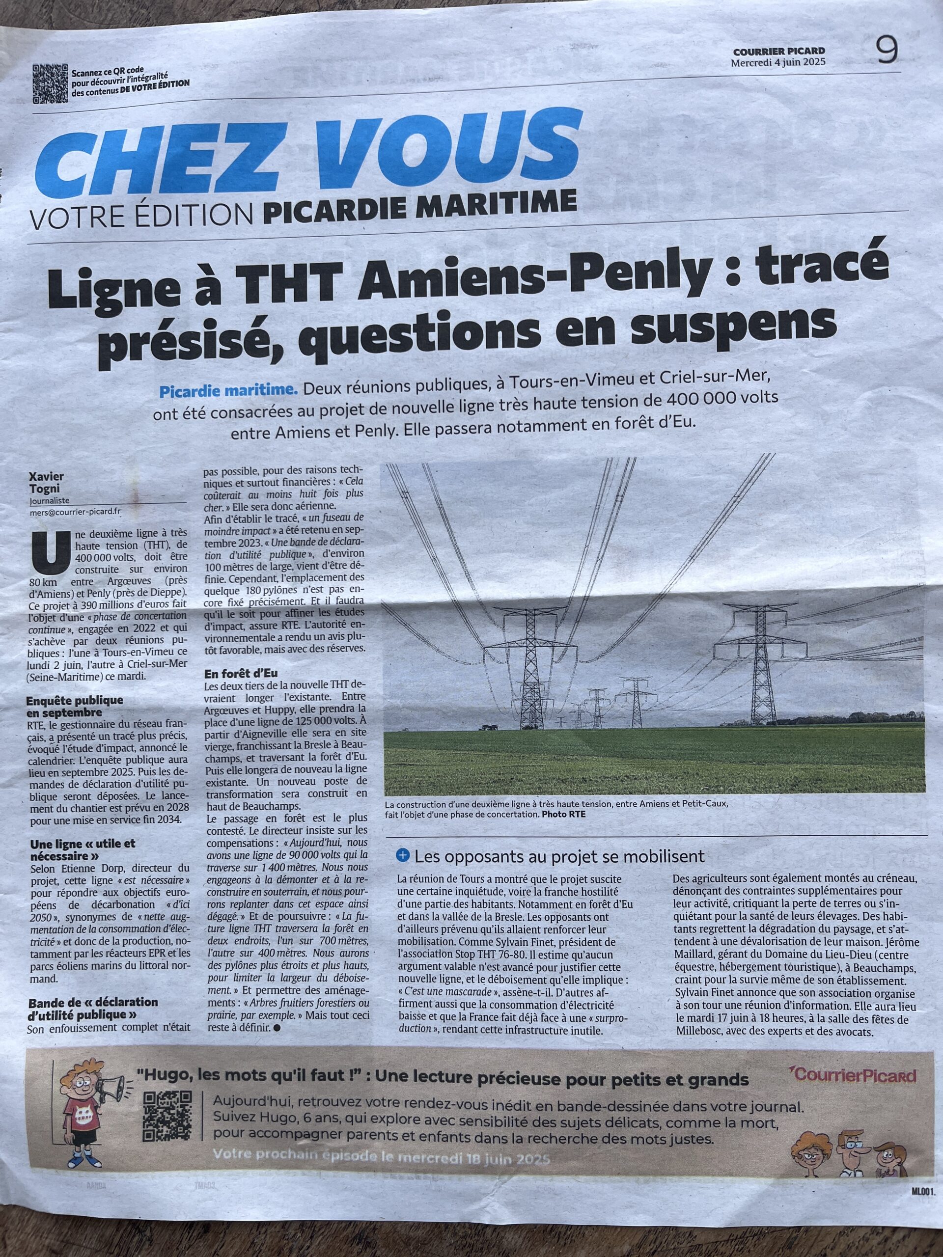 Énergie Ligne à THT Amiens-Penly : tracé précisé, questions en suspens. Courrier Picard 4 juin 2025 : Une deuxième ligne à très haute tension va être construite par RTE. L’association Stop THT 76-80 conteste la nécessité de cette ligne et l’impact qu’elle aurait sur la forêt d’Eu et la vallée de la Bresle.