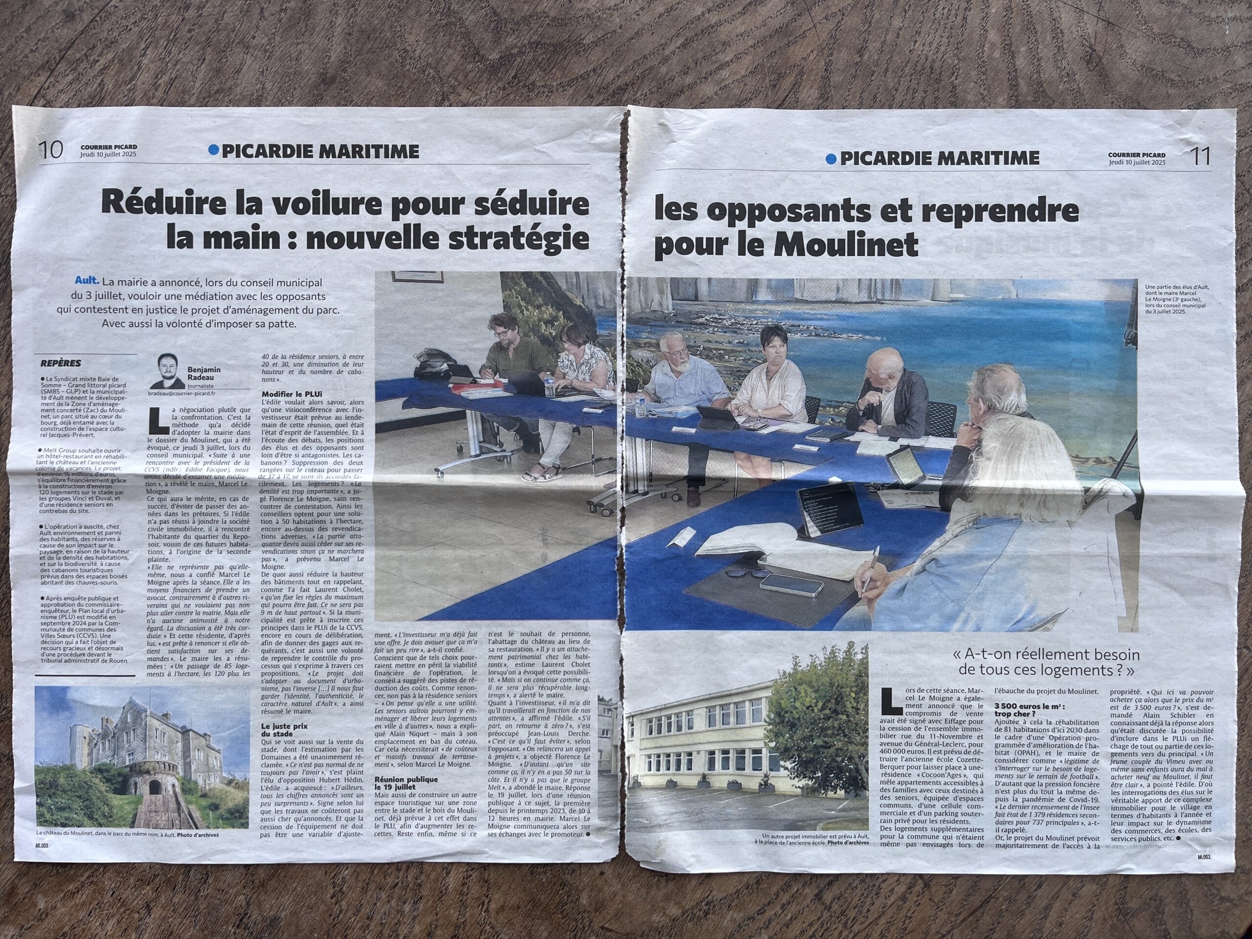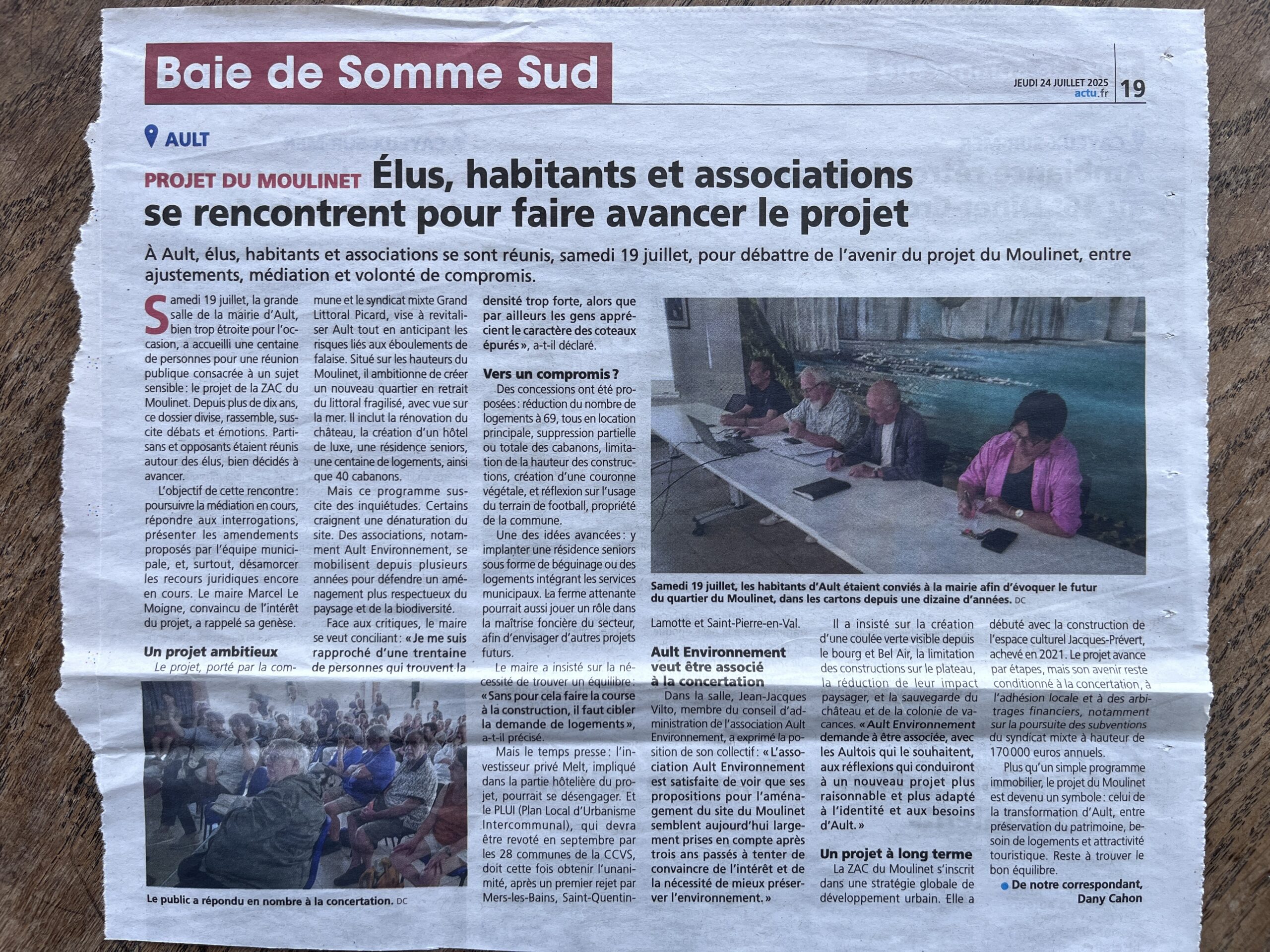 Aménagement du Moulinet « Ault. Un recours judiciaire contre le projet du Moulinet » Le Courrier Picard 22 avril 2025 : L’auteur de ce recours n’était pas connu par le maire qui a donné l’information lors de la réunion publique du 19 avril.