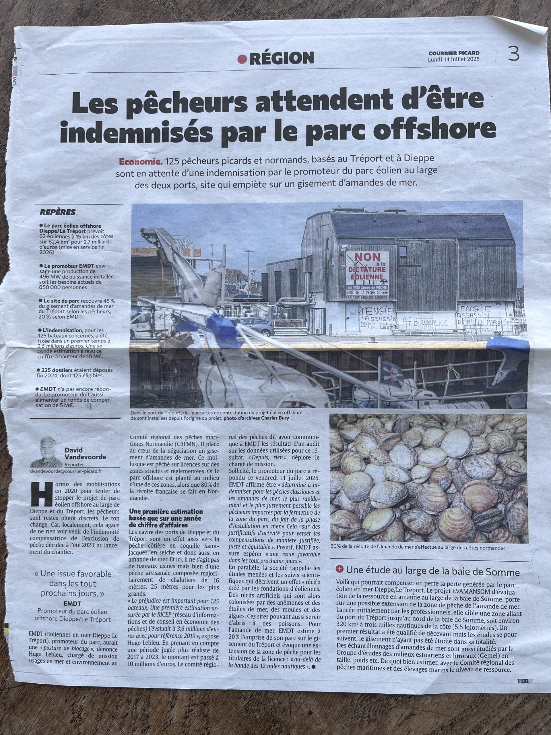 Énergie-Littoral Les pêcheurs attendent d’être indemnisés par le parc offshore. Courrier Picard 14 juillet 2025