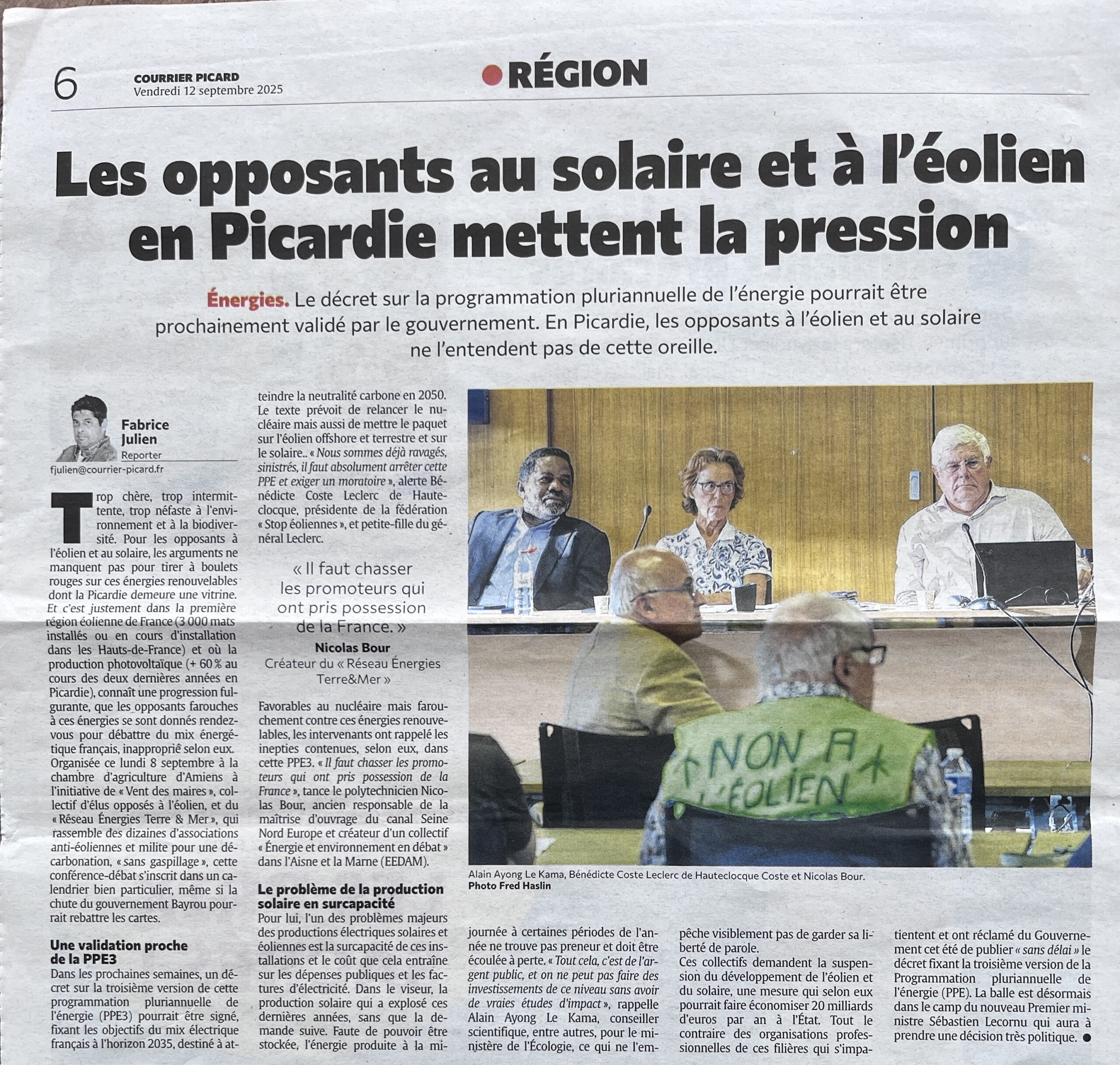 Énergie-Littoral Les associations mobilisées contre le parc éolien en mer. L’Informateur 7 juillet 2025 : Un pêcheur dénonce l’installation du parc « dans la meilleure zone de pêche. Nous avons proposé une autre zone mais ils n’ont pas voulu ». Ce n’est pas la société éolienne qui a refusé mais l’État lors du débat public en 2015. Des associations anti-éoliennes considèrent par ailleurs que l’éolien n’est pas la solution sur le plan énergétique ni sur le plan écologique et qu’il va entraîner une hausse de la facture d’électricité. C’est un sujet compliqué de controverse sur les avantages et inconvénients des différentes sources d’énergie, sans parler du choix de société sur l’évolution de la consommation électrique.